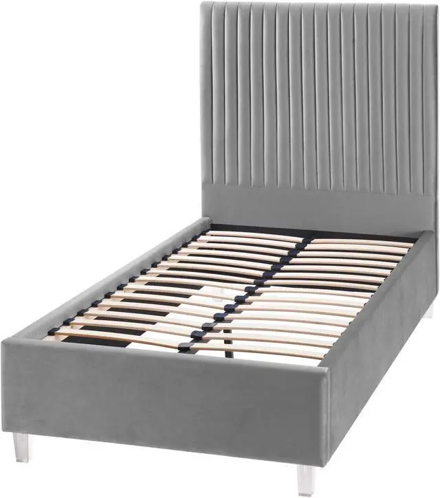 - ATTRIBUTES: upholstered, deep channel tufted design, clear acrylic legs, slats included, no box spring needed.