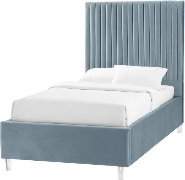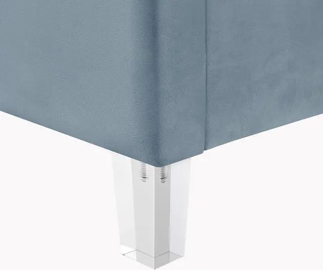 - ATTRIBUTES: upholstered, deep channel tufted design, clear acrylic legs, slats included, no box spring needed.