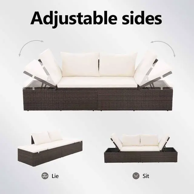 Our sun bed is made of PE rattan, which is lightweight, water-resistant, easy to clean and designed to be used outdoors for year round. The powder-coated steel frame also brings stability and ensures its excellent durability. Both sides of the bed can be pulled up and adjusted in different settings for the most comfortable seating or lying position. The thickly-padded, removable cushion and pillows with foam filling will provide the ultimate comfort. The low-maintenance polyester cushion cover can be easily removed and washed. The lounge bed is easy to assemble. Delivery includes 1 lounge bed, 1 large seat cushion and 2 back pillows.