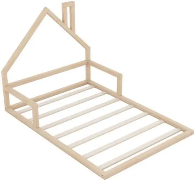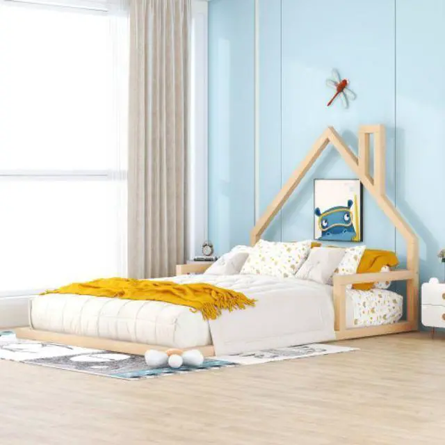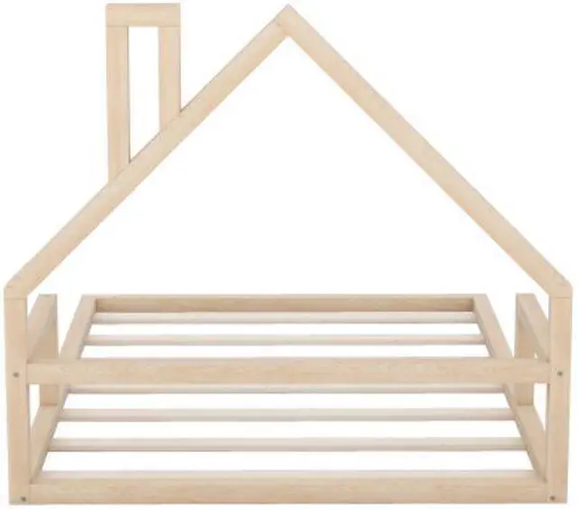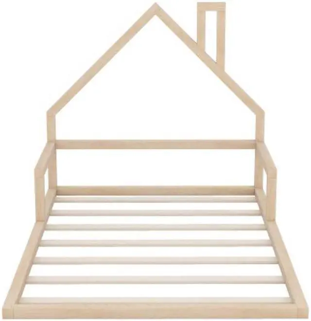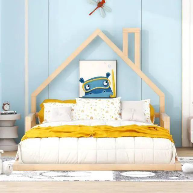 Full Size Wood Floor Bed with House-shaped Headboard, Natural