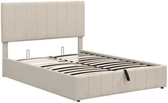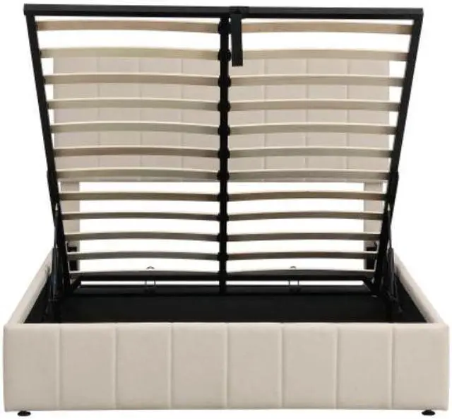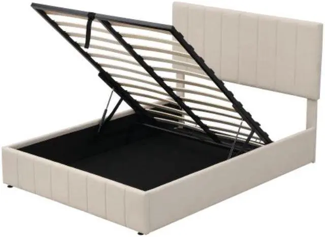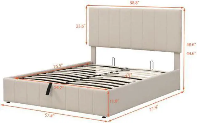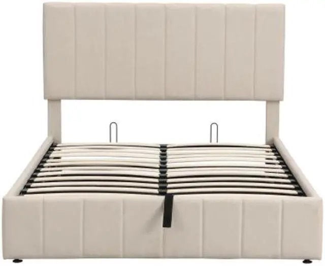 This beautiful Upholstered Platform Bed features upholstered headboard that adds a contemporary chic look to your bedroom and filled in thick foam to add extra comfort. Sturdy wood frame construction and a wooden slat system to add extra stability and safety. A hydraulic storage system underneath the mattress makes storing your bedroom things in smaller spaces possible without compromising the size of bed you want. What's more, this product arrives with a slat kit, do not miss the chance take it home today.
