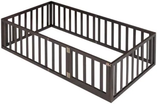 Twin Size Wood Floor Bed Frame with Fence and Door