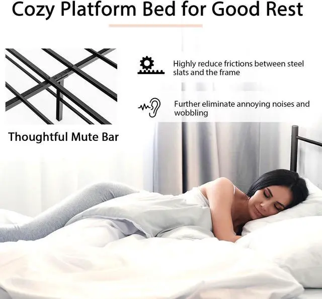 Mute Bar to Reduce Squeaks: Unlike beds without the silent design, the platform bed comes with considerate mute bars, intending to reduce frictions between steel slats and frame. Thus, there will be no more annoying squeaks when you turn over at night, a peaceful sleeping will be highly ensured.