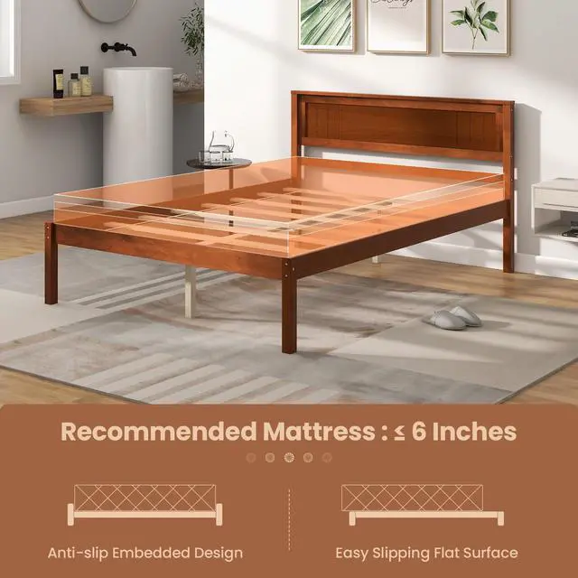 Non-slip Embedded Platform: No box spring needed! The user-friendly bed frame features an embedded platform that keeps the mattress in place. Its slatted surface ensures good ventilation and even support for mattress. By the way, a mattress of no more than 6" thick is recommended.