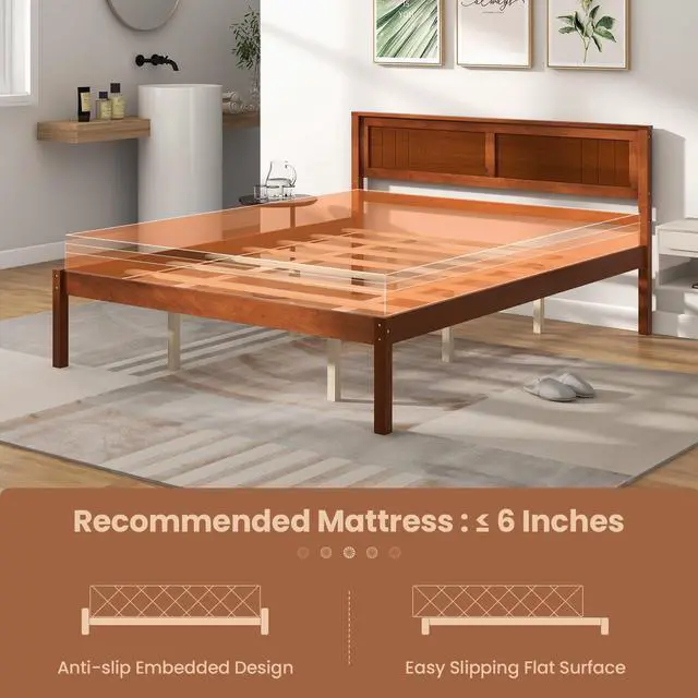 Non-slip Embedded Platform: No box spring needed! The user-friendly bed frame features an embedded platform that keeps the mattress in place. Its slatted surface ensures good ventilation and even support for mattress. By the way, a mattress of no more than 6" thick is recommended.