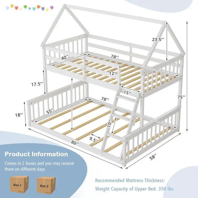 2 Shipping Boxes and Fast Assembly: This twin over full bed comes with 2 packages that may arrive on different days, please wait for them patiently. The detailed instructions and numbered parts are included, so that the bed can be assembled conveniently. The recommended mattress thickness for each bed is 6"(not included).