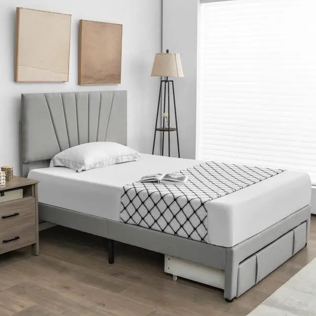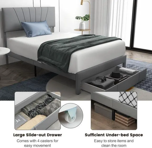 Bed Frame with Drawer: There is a pull-out drawer underneath the bed frame to store your out-of-season clothes, bedding or other sundries, further enhancing space utilization. And the drawer is equipped with flexible wheels for easy sliding in and out. Also, 8.5" under-bed space gives you additional storage space.