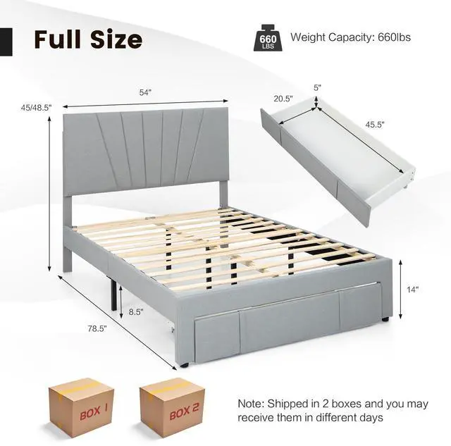 Sturdy Wooden Construction: Made of solid wooden slats with tight connection, this bed frame is stable and durable enough to support long-lasting use. Additionally, sturdy middle metal legs provide enhanced support, which enables the platform bed to hold up to 660 lbs. Note: Shipped in 2 boxes and you may receive them in different days.