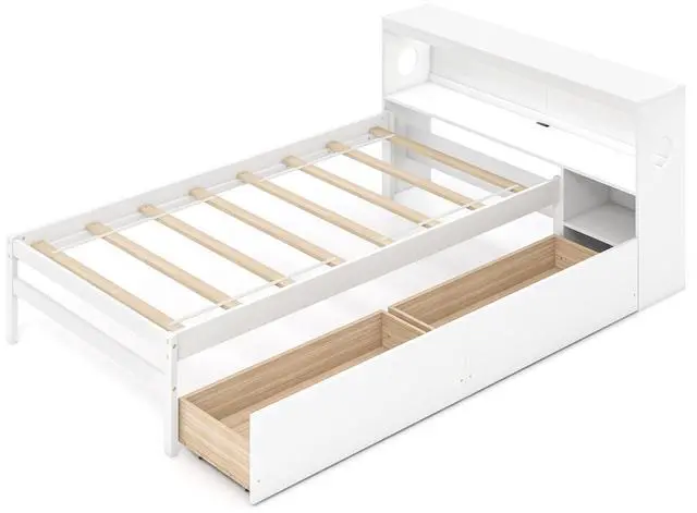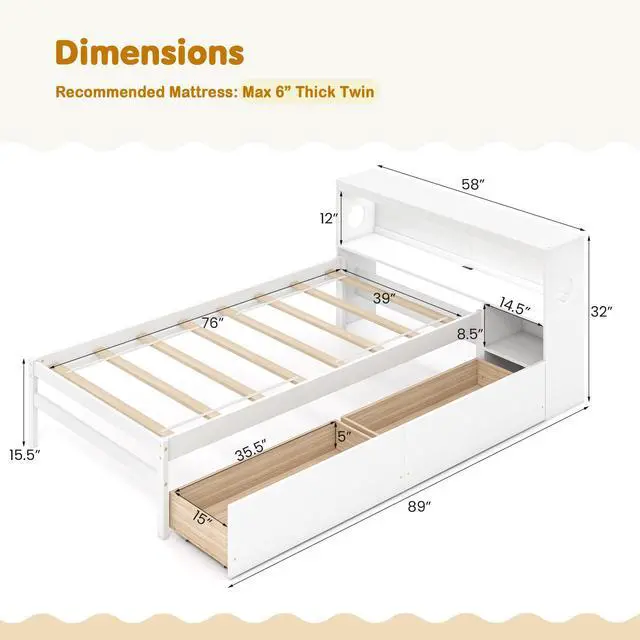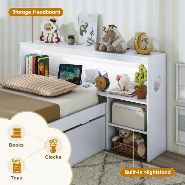 Storage Headboard and Nightstand: The twin bed frame features a multipurpose bookcase headboard and a sleek, integrated 2-tier nightstand. It offers ample storage perfect for storing bedtime reads and essentials close at hand, making it ideal for compact spaces!