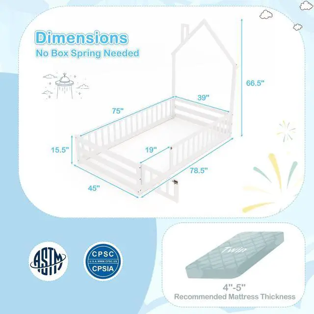 Whimsical House Design: Featuring a charming house silhouette complete with a mini chimney, this bed frame offers a playful foundation for decorationsperfect for string lights, photos, or festive flags. Certified to ASTM and CPSIA standards for safe use.