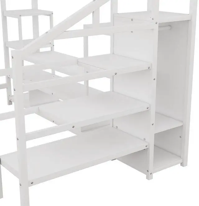 With Stairs and Wardrobe: The full size loft bed is equipped with stairs, making your kids easy and safe to climb up and down. Each steps have built-in storage spaces for shoes and other items. Additionally, a small wardrobe is included for hanging clothes, meeting your daily storage needs. The stairs can be placed in both left or right side.