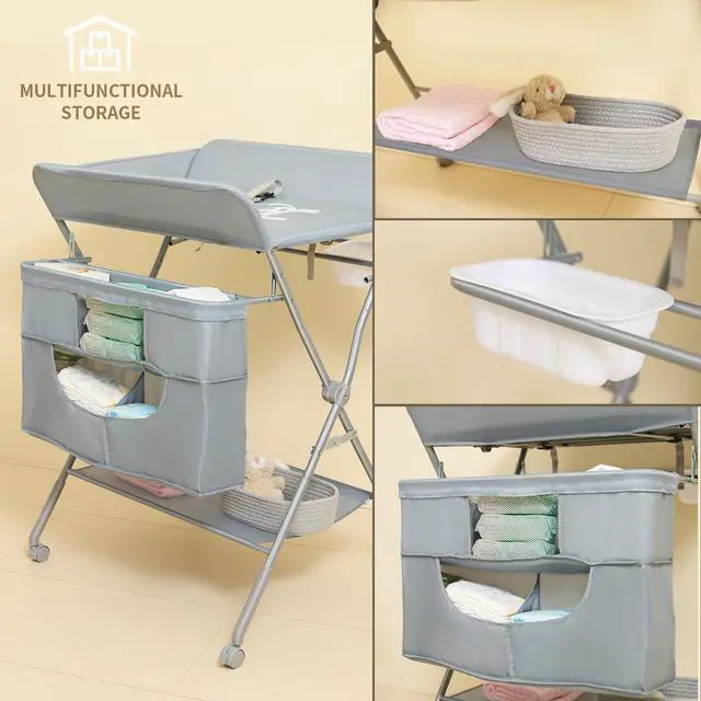 Designed with a 4-level adjustable height (38.2-39.4-40.5-41.7 inches), this diaper changing table is the perfect match for parents of any heights (5-6ft), and no more bending over with backache to change the diapers. The multiple storage organizer that is the perfect size to store diapers, wipes, baby bottles, and other necessities. The versatile design of the portable changing tables for babies, also the bars allow you to hang items. The inclusion of a small trash simplifies the disposal of diapers, keeping the nursery odor-free and hygienic. It is easy to move around with four universal wheels, which have safety clips to keep the table in place. Its easy to fold down when not in use.