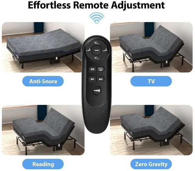 10-button Multifunctional Wireless Remote Easy to Control in Bed:Master your perfect sleep position with effortless wireless control. Independently raise/lower the head & foot sections, activate zero-gravity mode, save two custom presets (M1/M2), instantly flatten the bed, optimize for TV viewing, and locate the remote via built-in