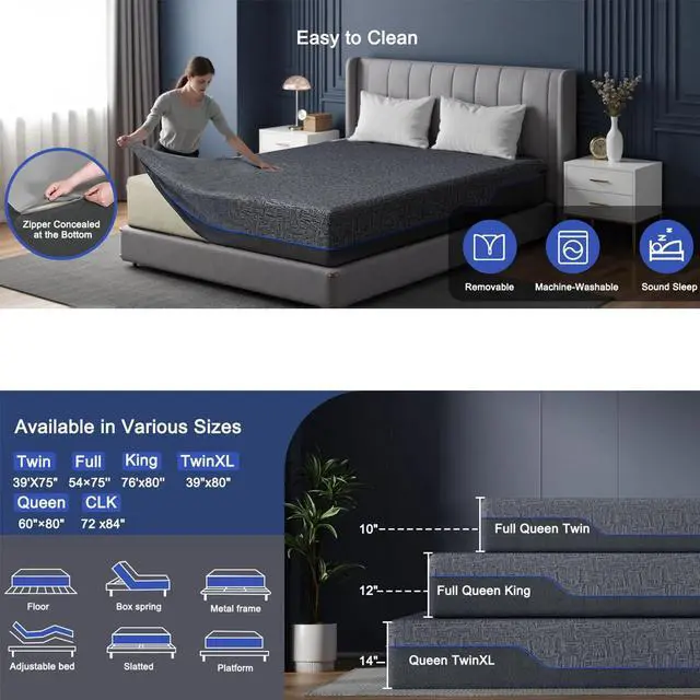14-Inch Gel Memory Foam Mattress with Graphene Cover:This premium queen memory foam mattress features a triple-layer structure: gel-infused memory foam for cooling, wave-cut airflow foam for ventilation, and high-density base foam for stability and spinal alignment. The removable graphene-infused cover offers enhanced temperature regulation and easy cleaning, keeping your bed fresh and cool all night.