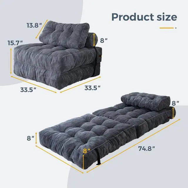 Durable Fabric: Crafted from premium corded fabric, this material offers a unique visual and tactile experience, elevating the ambiance of your living space. The size of the folding sofa bed is about 33.5"x74.8", which would be tailored to provide comfortable seating or bed for one person