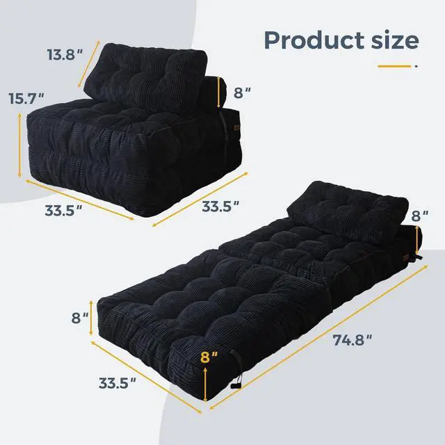 Durable Fabric: Crafted from premium corded fabric, this material offers a unique visual and tactile experience, elevating the ambiance of your living space. The size of the folding sofa bed is about 33.5"x74.8", which would be tailored to provide comfortable seating or bed for one person