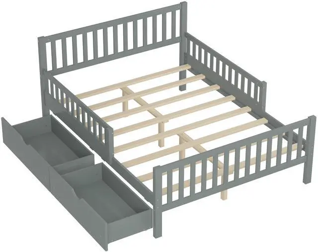 Full Size Wood Platform Bed with Guardrails on Both Sides and Two Storage Drawers, Gray