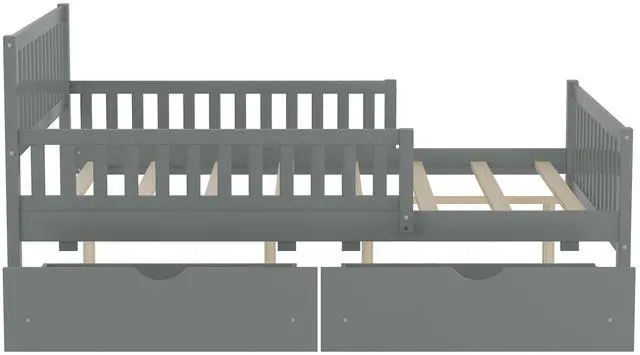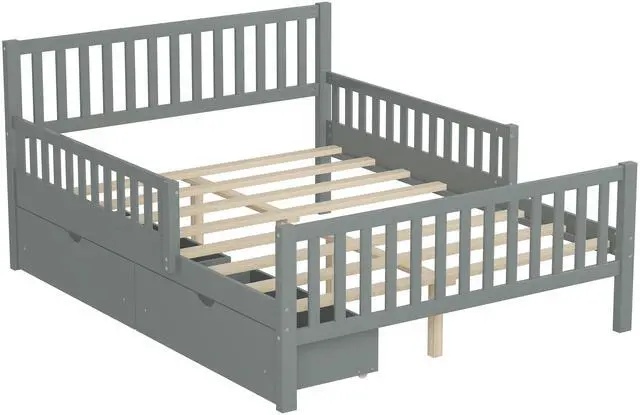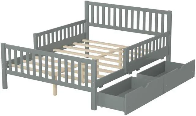 • Full Size Wood Platform Bed with Guardrails on Both Sides and Two Storage Drawers, Gray