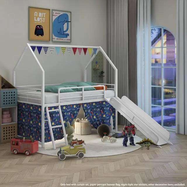 DIY Fun]: Transform your child's room into a playful sanctuary with our house-shaped bunk bed featuring a slide. Complete with a pennant banner flag and luminous star stickers for endless decoration possibilities. The lower bed's curtain provides a cozy, private space, perfect for hide and seek adventures, encouraging imaginative play and a sense of security.