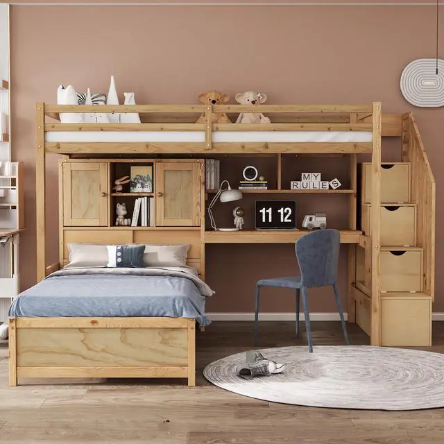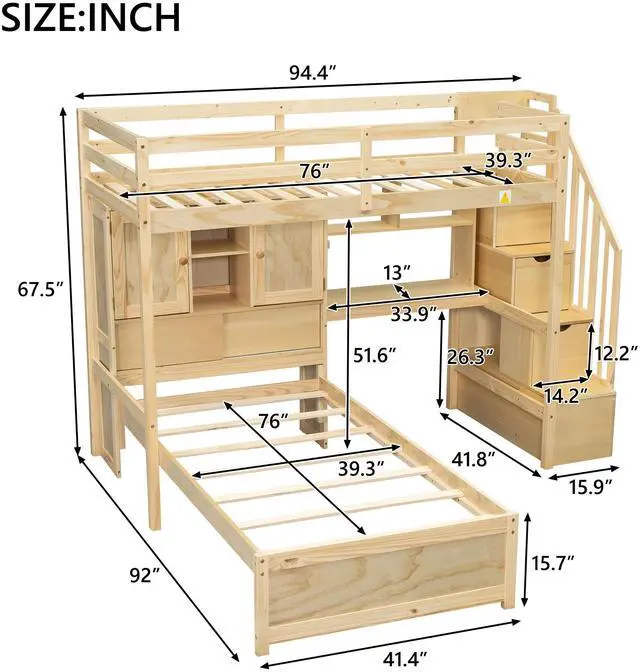 [Twin over Twin] Coming with twin over twin loft bed features one twin size loft bed with Staircase and one twin size platform bed with storage space