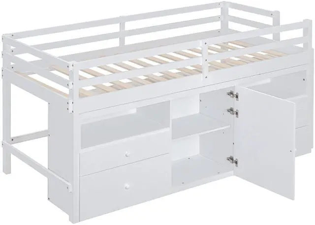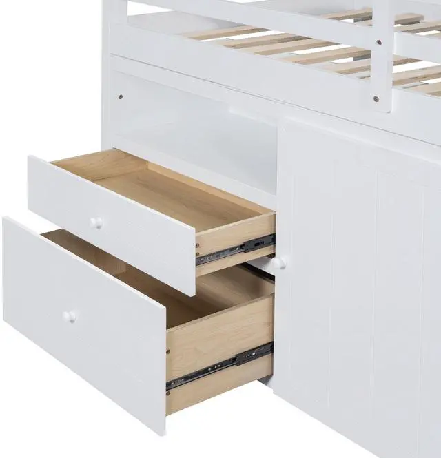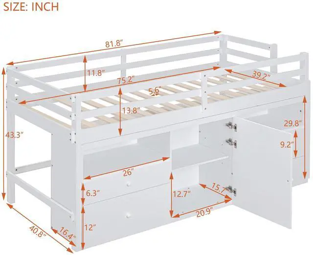 [Space-saving]The 4 big drawers underneath the loft bed, the shelves along with the Cabinet work together to provide you enough space to store home items. It saves your a lot of trouble and make your room tidy and clean.