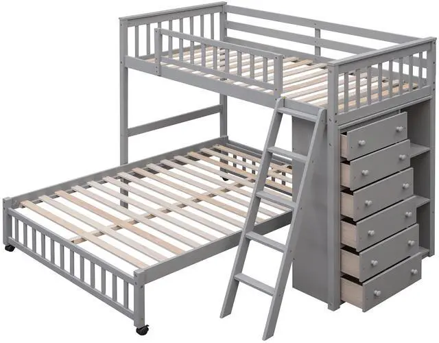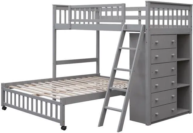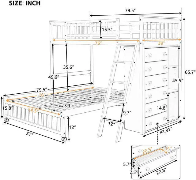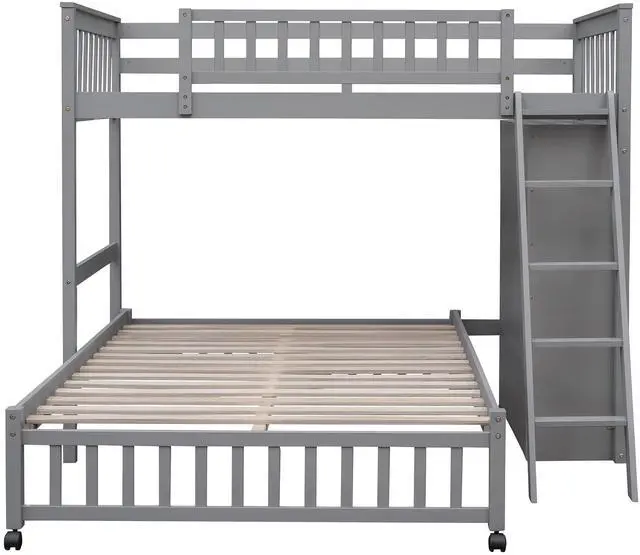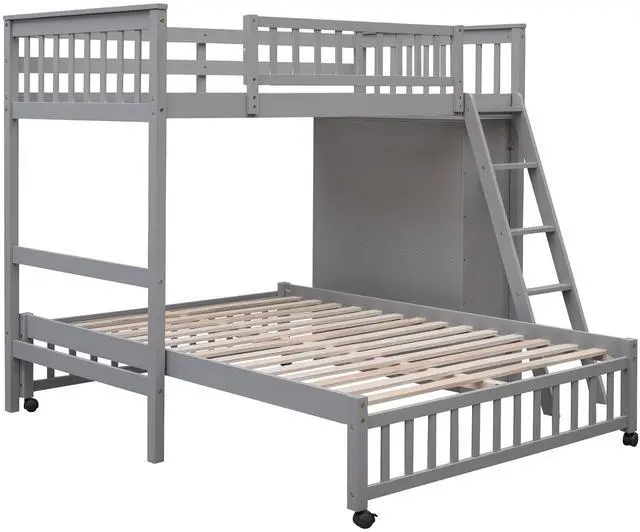 [Versatility galore]This bunk bed features one twin size upper bunk, one full size bottom bunk for accommodating your family or any overnight sleepers. What's more, the bottom bed is designed with wheels, you can put the bottom bed in wherever you want.