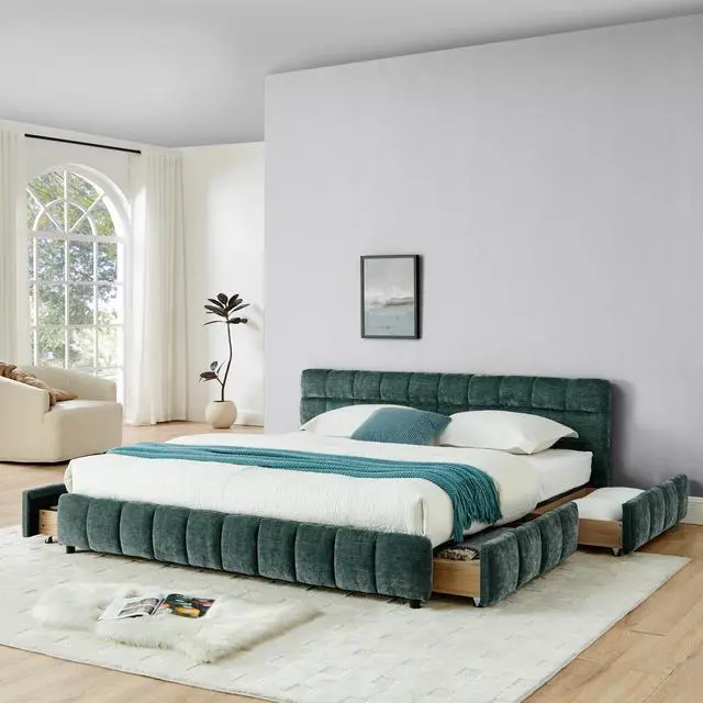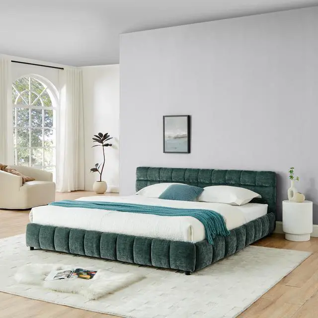 [Unique Grounded King Size Bed] - This grounded upholstered bed will be both a beautiful piece in the room and a place full of fun for your family. This beautiful modern King bed frame adds a contemporary chic look to your bedroom and is upholstered in thick chenille fabric to add extra comfort.