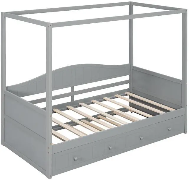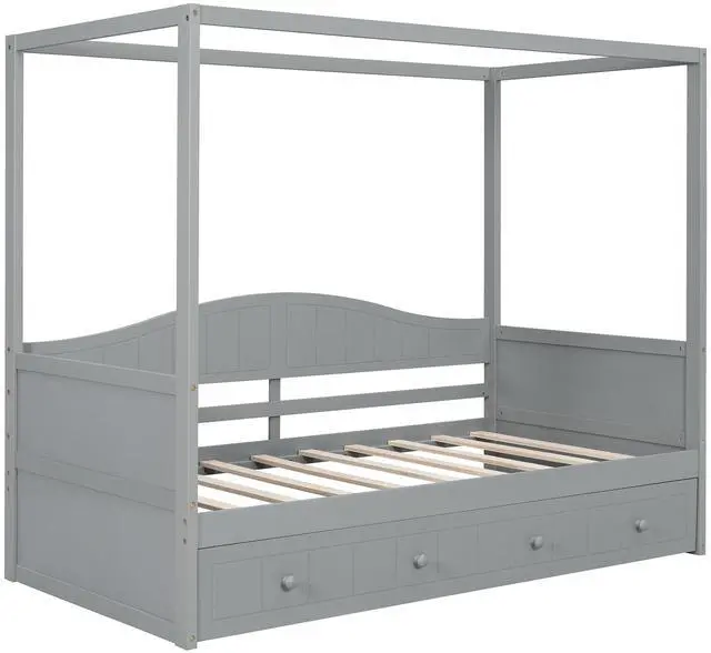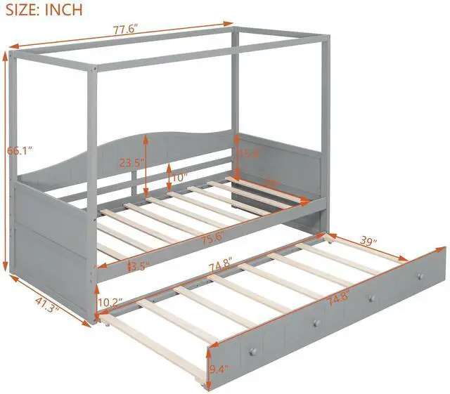 [Dimensions] Overall bed dimension: 77.6"L x 41.3"W x 66.1"H. This canopy bed with clear instructions and hardware in the box.