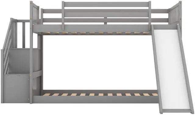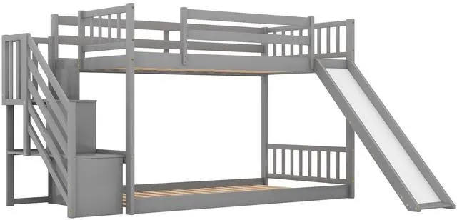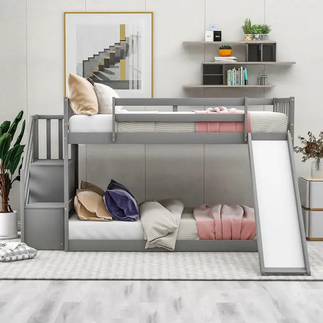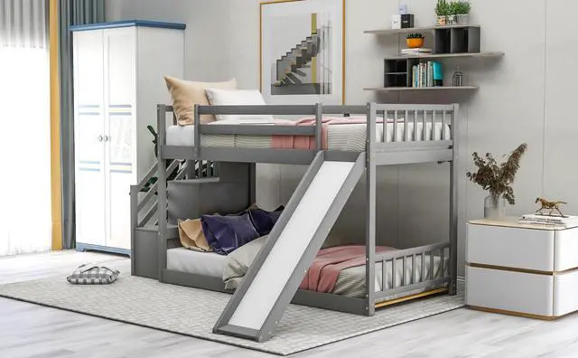 Space-saving: compact low bunk design and storage shelves. Sturdy and long-lasting: made of high-quality solid wood and MDF. Extra fun: a slide is included. Assembly required