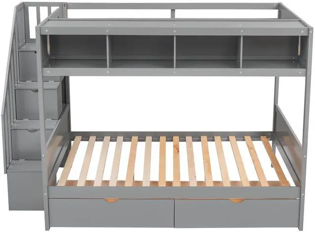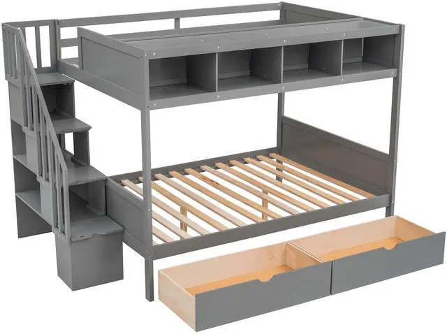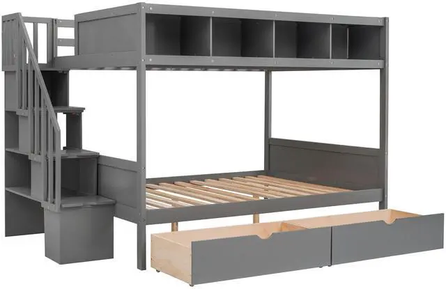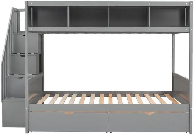 [Versatility galore] This bunk bed features one twin size upper bunk, one full size bottom bunk for accommodating your family or any overnight sleepers. The staircase can be installed on both sides, depending on how you want to organize your space.