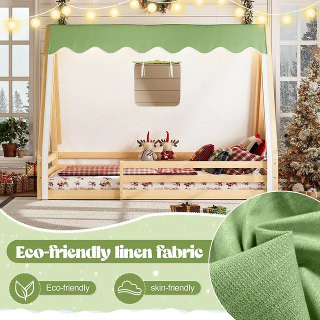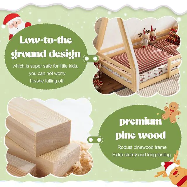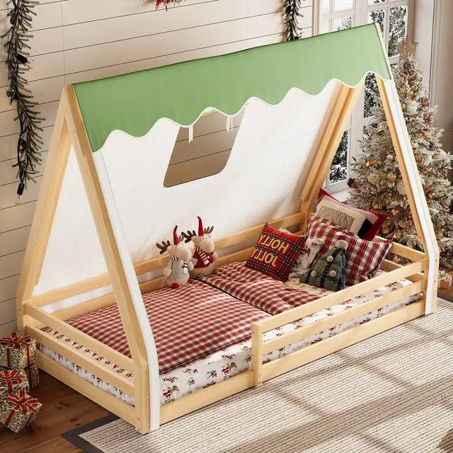 Sturdy Solid Wood ConstructionMade from high-quality solid wood, this teepee floor bed offers exceptional durability and strength. The sturdy frame is built to last, providing reliable support for your child's mattress without the need for a box spring.