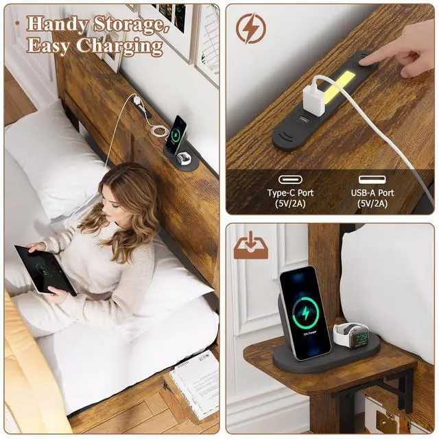 Bedside StorageThe headboard features a storage shelf for easy placement of small personal items like phones and glasses. Additionally, there are two foldable side tables (each with a weight capacity of 4kg) on either side of the bed for convenient use