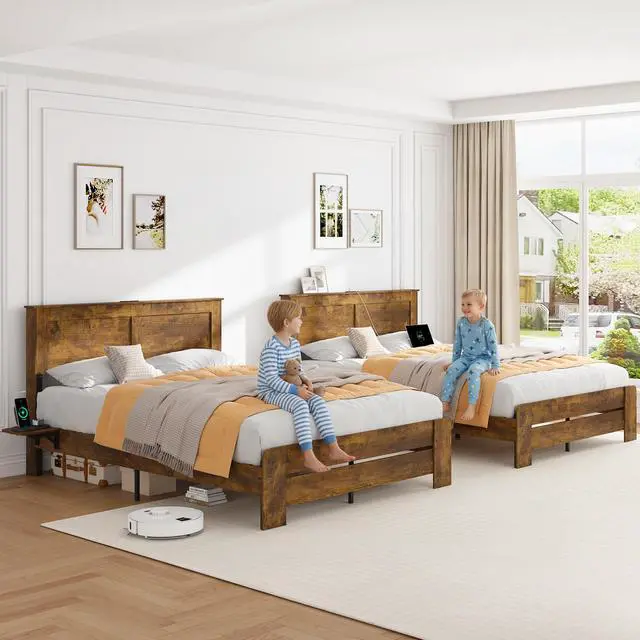 Charming Rustic FarmhouseThe simple bed frame perfectly blends the ruggedness of industrial style with the warmth of retro style. The embedded blue LED light strip on the headboard serves as the finishing touch, breaking the monotony of traditional beds and successfully balancing aesthetics with functionality, as well as retro and modern elements.