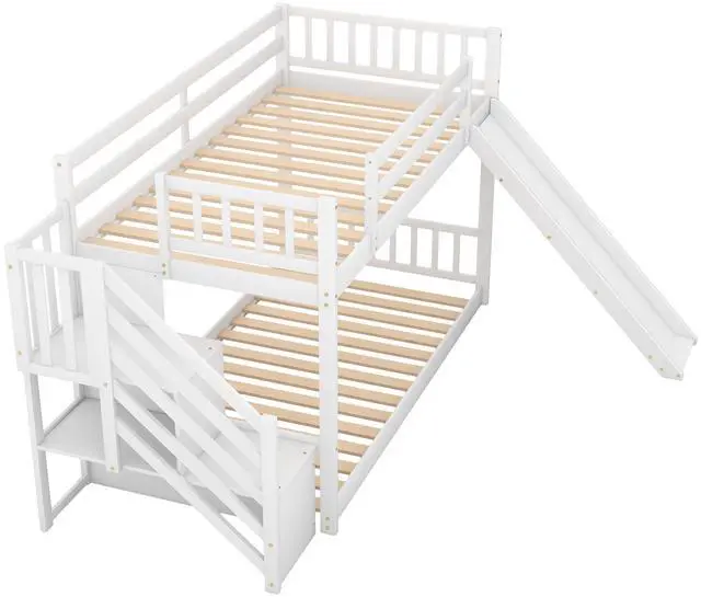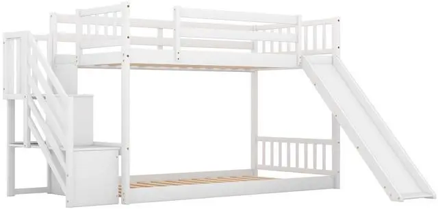 Space-saving: compact low bunk design and storage shelves. Sturdy and long-lasting: made of high-quality solid wood and MDF. Extra fun: a slide is included. Assembly required