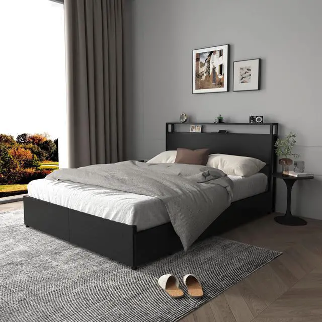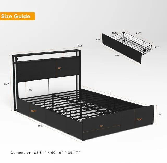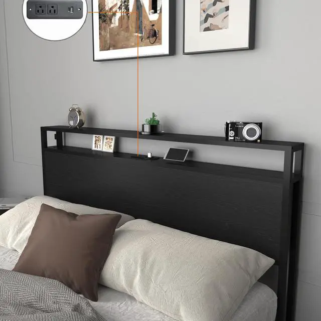 Storage Headboard with Convenient Charging StationThe 2-tier storage shelf on the headboard provides more storage space for magazines, cell phones, alarm clocks and other frequently used items. Improved backboard design prevents dropping of small items