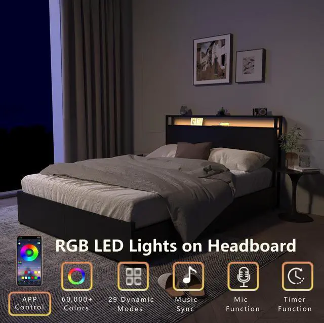 Built-In Lighting + ChargingDimmable LEDs & dual USB outlets on this queen bed frame with headboard - mood lighting & convenience combined.