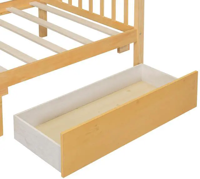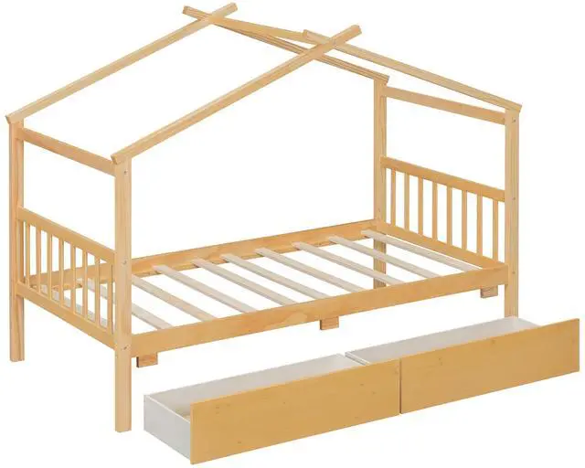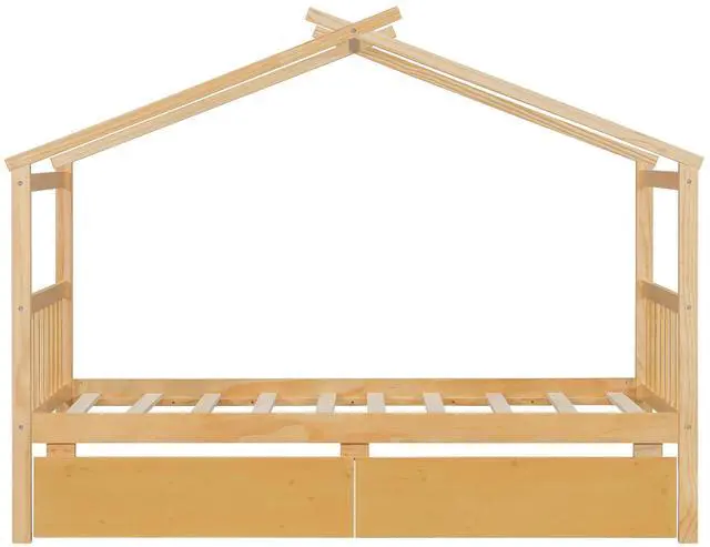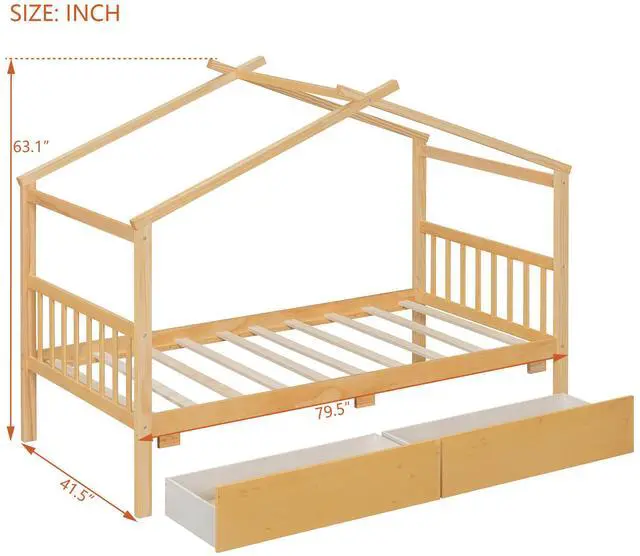 [Spacious Storage] The wood house platform bed with two drawers offer storage space for clothes and toys, Maximize space and help to develop your child's habit of storage. It's a perfect space-saving solution to you.