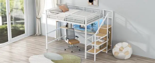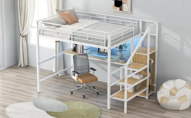 Full Size Metal Loft Bed with Desk, Storage Staircase, Small Wardrobe and LED Light, White