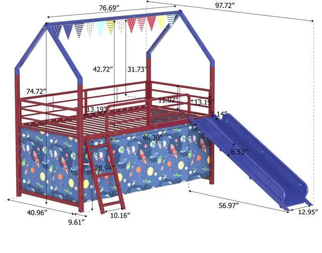 DIY Fun]: Transform your child's room into a playful sanctuary with our house-shaped bunk bed featuring a slide. Complete with a pennant banner flag and luminous star stickers for endless decoration possibilities. The lower bed's curtain provides a cozy, private space, perfect for hide and seek adventures, encouraging imaginative play and a sense of security.