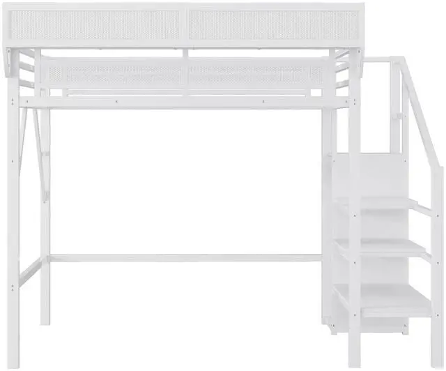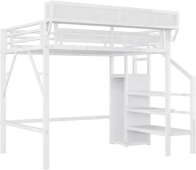 Metal Twin XL Loft Bed with StaircaseThe metal twin size loft bed come with staircase includes built-in storage compartments, making it easy to store items like shoes, toys, or blankets. The steps ensure safe and convenient access to the upper bed, enhancing both practicality and safety. The stairs can be installed on either right side or left side.