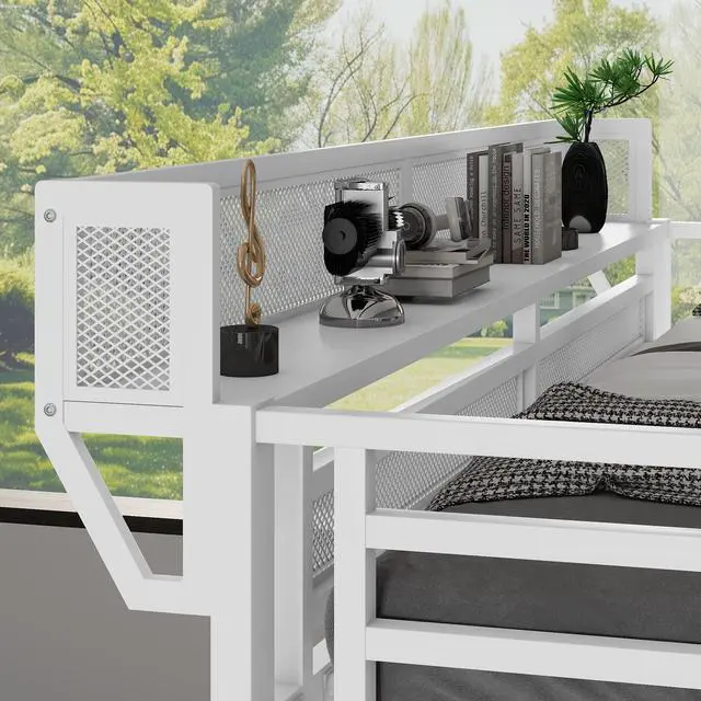Twin XL Loft Bed with Storage Shelves for UpperThe twin metal loft bed features a storage shelf next to the upper bed, providing extra storage space. This shelf is perfect for keeping books, gadgets, or small items within easy reach. The shelf have mesh around which prevent thing falling down. It adds functionality without compromising space.