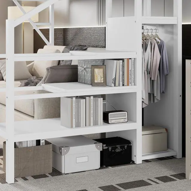 Metal Loft Bed with WardrobeThe staircase features a built-in wardrobe function, providing additional storage for clothes and accessories. This clever design adds more functionality to the metal full loft bed, making it a perfect solution for small bedrooms.