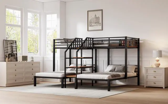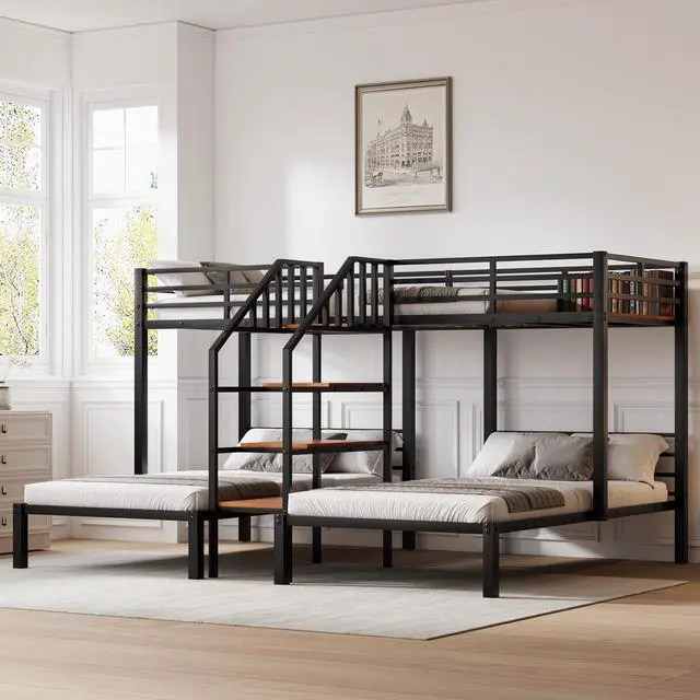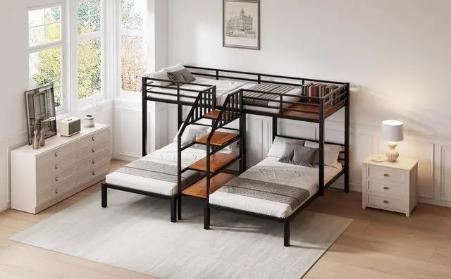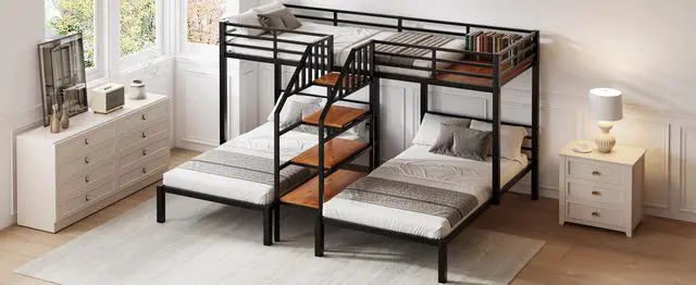 [Multiple Storage Space] The 4-tier shelf is both a storage shelf and a staircase. The upper bed also comes with a 21.3" x 39" plank where you can put toys and more. Theres spacious space under the down beds.