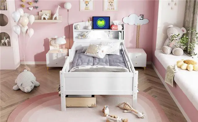 [Storage Space] The bed provides 2 storage shelves on the headboard and 2 drawers underneath. Your toys, books or beddings all have their proper home.