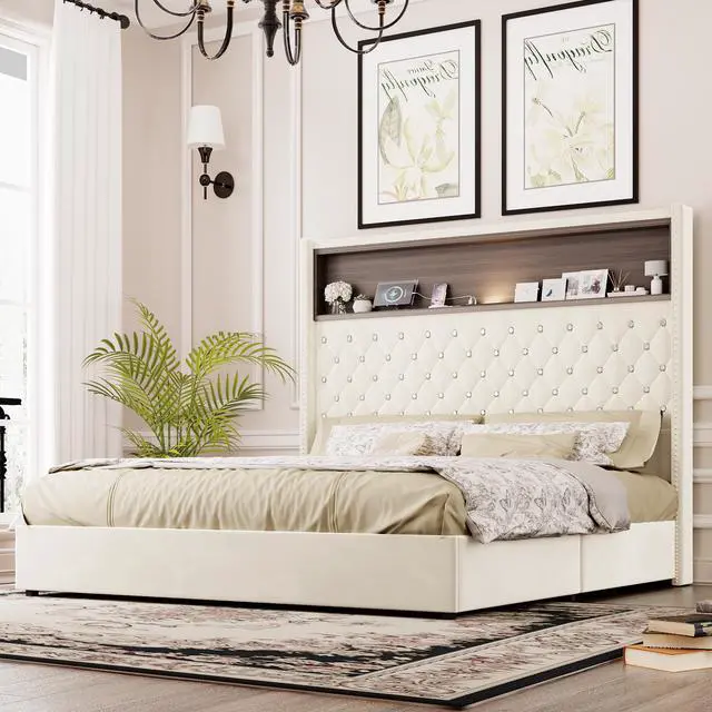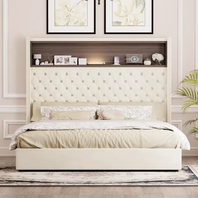 • Queen Size Velvet Tufted Soft Bed Frame with USB Port and Night Light,52'' High Headboard with Rivet Decoration, Wing-back Platform Bed with Headboard Shelf, Beige
