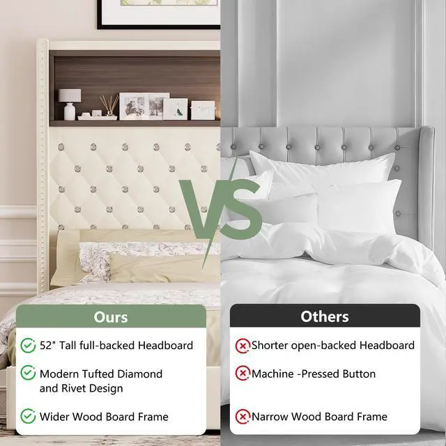 Wing-Shaped Backrest and Storage Rack Structure: The wing-back design enhances the sense of wrapping. The top is equipped with an internal storage rack where you can place photo albums, alarm clocks or small trinkets, making the bedroom neater and more organized.