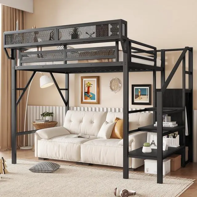 Metal Twin Loft Bed with StaircaseThe metal twin size loft bed come with staircase includes built-in storage compartments, making it easy to store items like shoes, toys, or blankets. The steps ensure safe and convenient access to the upper bed, enhancing both practicality and safety. The stairs can be installed on either right side or left side.