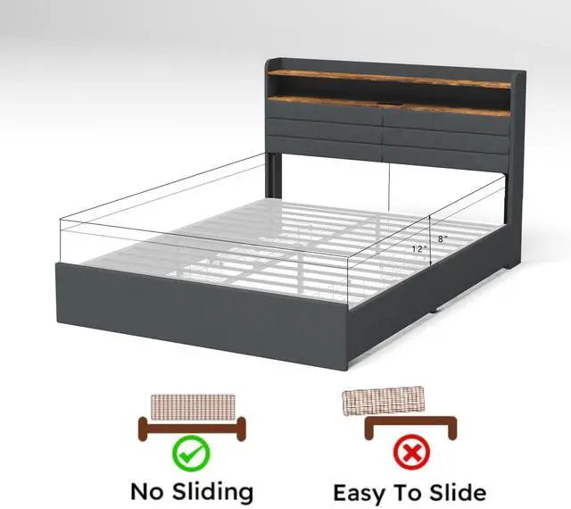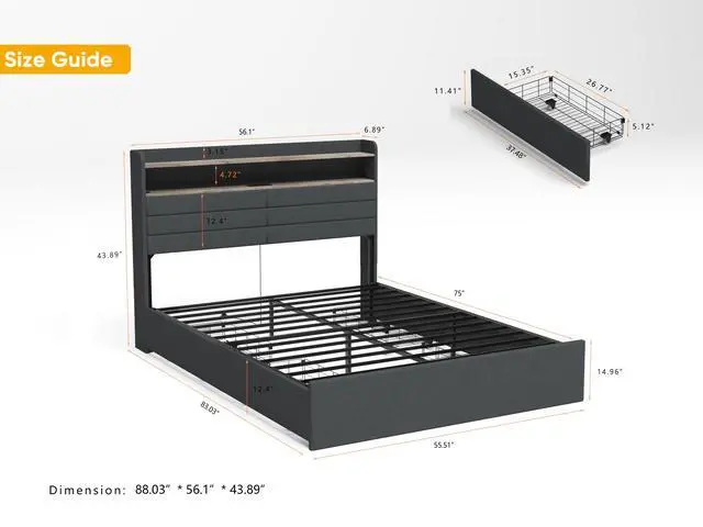 Full Bed Frame with Headboard Full size bed includes a built-in charging station with 2 AC outlets, 1 USB port, 1 Type-C port; Full bed frame with headboard shelf for daily essentials such as books, phones, cameras, etc