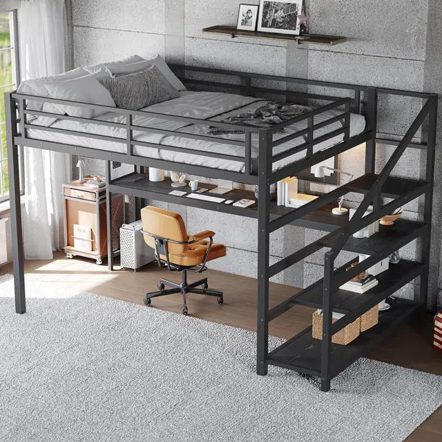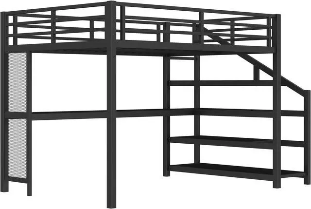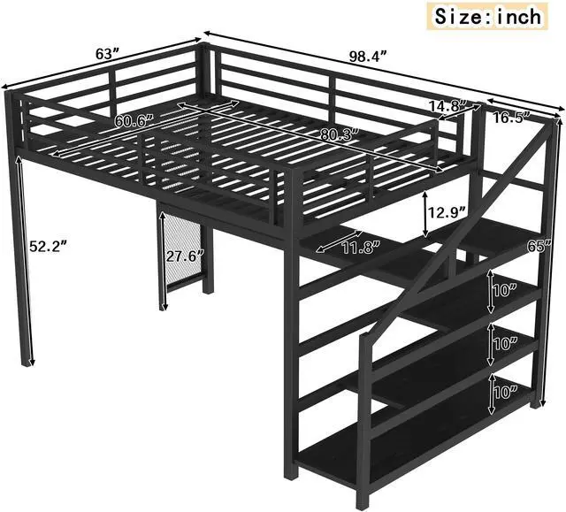 Space-Saving & Functional DesignThis queen loft bed with desk and storage stairs maximizes your room by combining a built-in desk, shelves, and sturdy stairs. The unique iron nets let you hang photos, calendars, or small items, making your space practical and personalized.