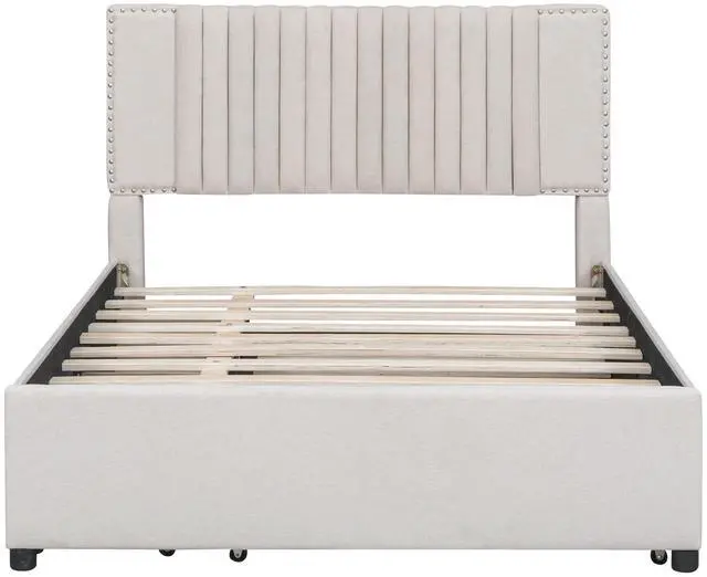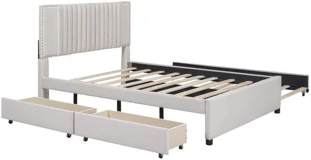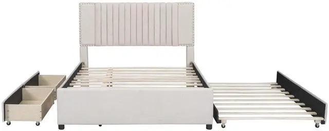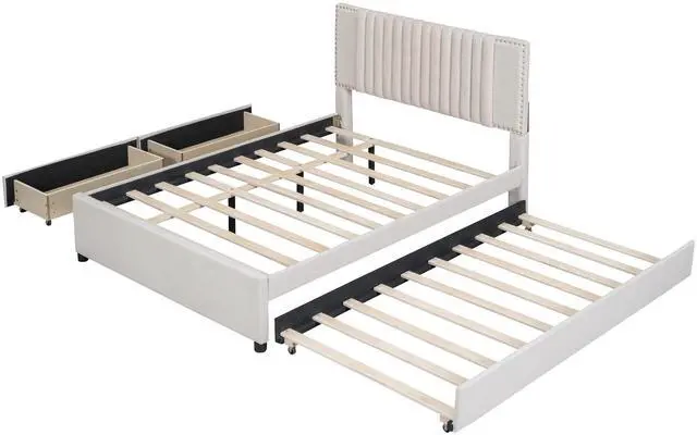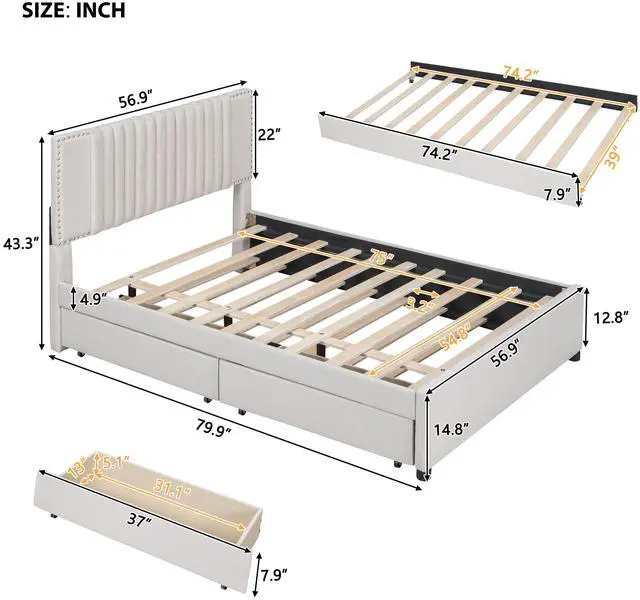[Maximized Space] The upholstered platform bed with two drawers and a large trundle can easily be pulled in and out for maximum storage space and extra sleeping area, perfect for organizing anything from clothes and bed linens to toys and games, and for sleepover.